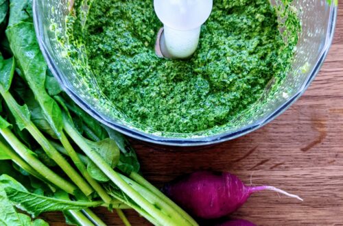 2 cibule a 2 řapíky celeru (nebo celerovou nať) nakrájejte nadrobno a osmahněte na olivovém oleji, přidejte 200g rýže arborio, restujte chvilku a potom přidejte malý svazek tymiánu a rozmarýnu a zalijte 2l zeleninového vývaru. Vařte 15 minut. Mezitím si v hmoždíři připravte pesto: na kašičku rozdrťte 2 stroužky česneku s trochou mořské soli, přidejte 50g nastrouhaného parmezánu, citronovou šťávu dle chuti a 4 lžíce olivového oleje. Do polévky přidejte 600g nadrobno nakrájené zeleniny (mrkev, petržel, cuketa, celer, mangold, ale i fenykl, brokolice, chřest, hrášek…) a povařte ještě 10 minut. Osolte a opepřete. Rozdělte na talíře a navrch přidejte lžíci pesta.