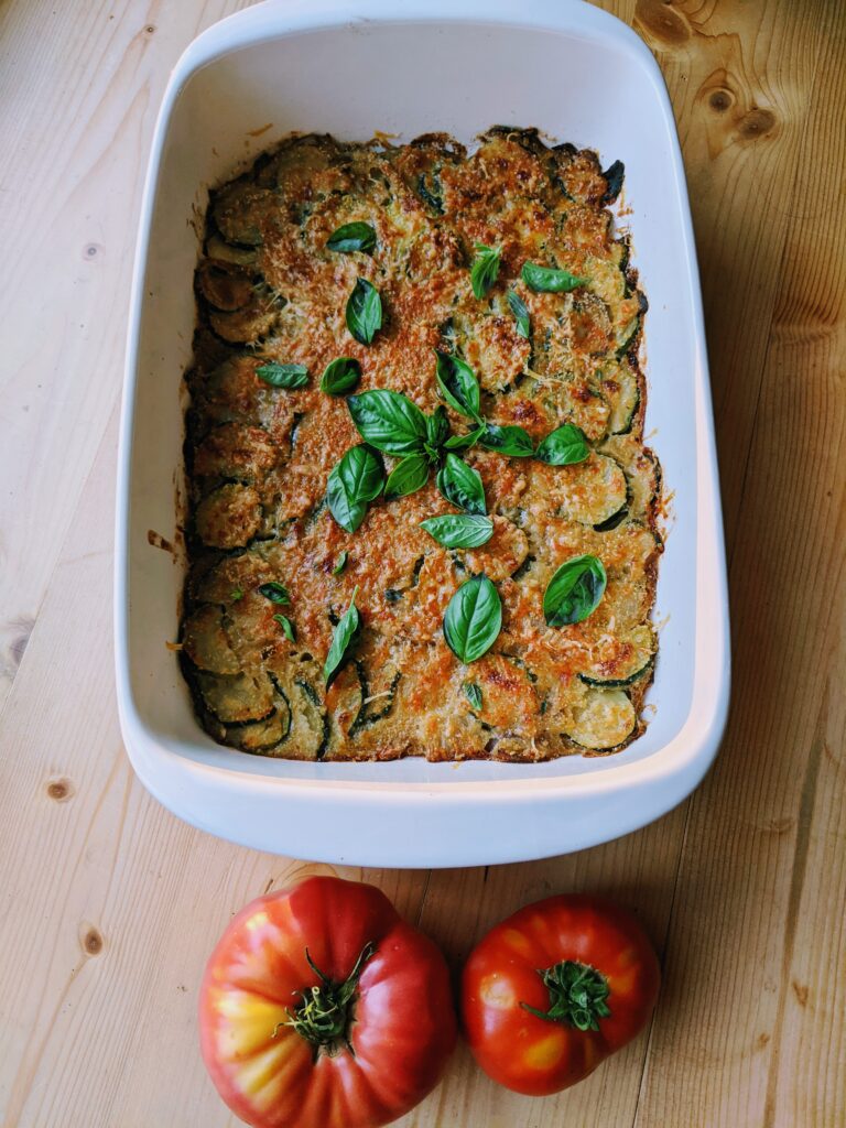 V pánci orestujte na oleji 1-2 cibule nakrájené na kolečka a 2-3 cukety na kolečka. Osolte, opepřete. Troubu předehřejte na 200 stupňů, plech nebo pekáč 20×30 vymažte olivovým olejem. Ve velké míse smíhcejte 1 hrnek hladké mouky, 1/3 hrnku polenty nebo kukuřičké krupice, sůl, pepř, česnekový prášek nebo česnek, hrnek vody a lžíci olivového oleje. Míchejte, dokud nevznikne hladké těsto, vsypte cibuli a cuketu, promíchejte, aby se zelenina obalila, rozprostřete do připraveného pekáče. Posypte strouhaným parmezánem, trochou krupice nebo polenty, zakápněte oliv.olejem a pečte 30-40 minut dozlatova. Před podáváním nechte 15 zchladnout. Nakrájené řezy posypte bazalkou.
